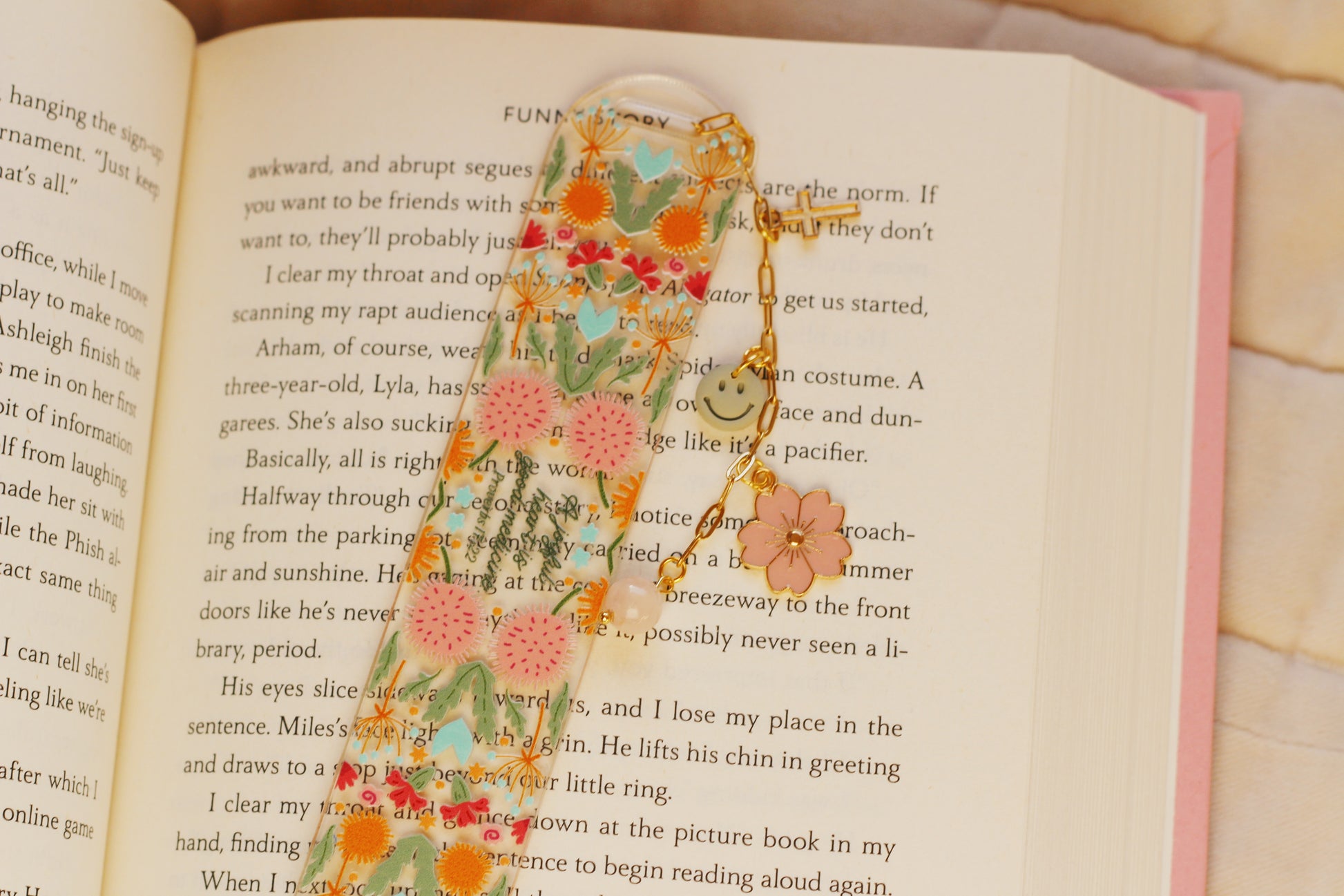 Acrylic bookmark with UV DTF design, clay and metal charms