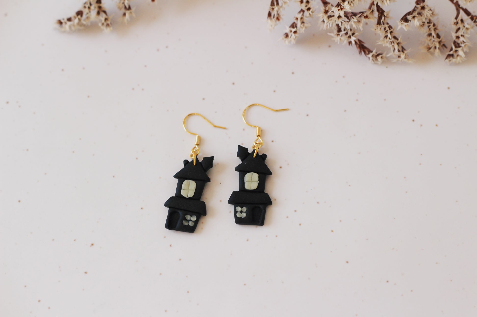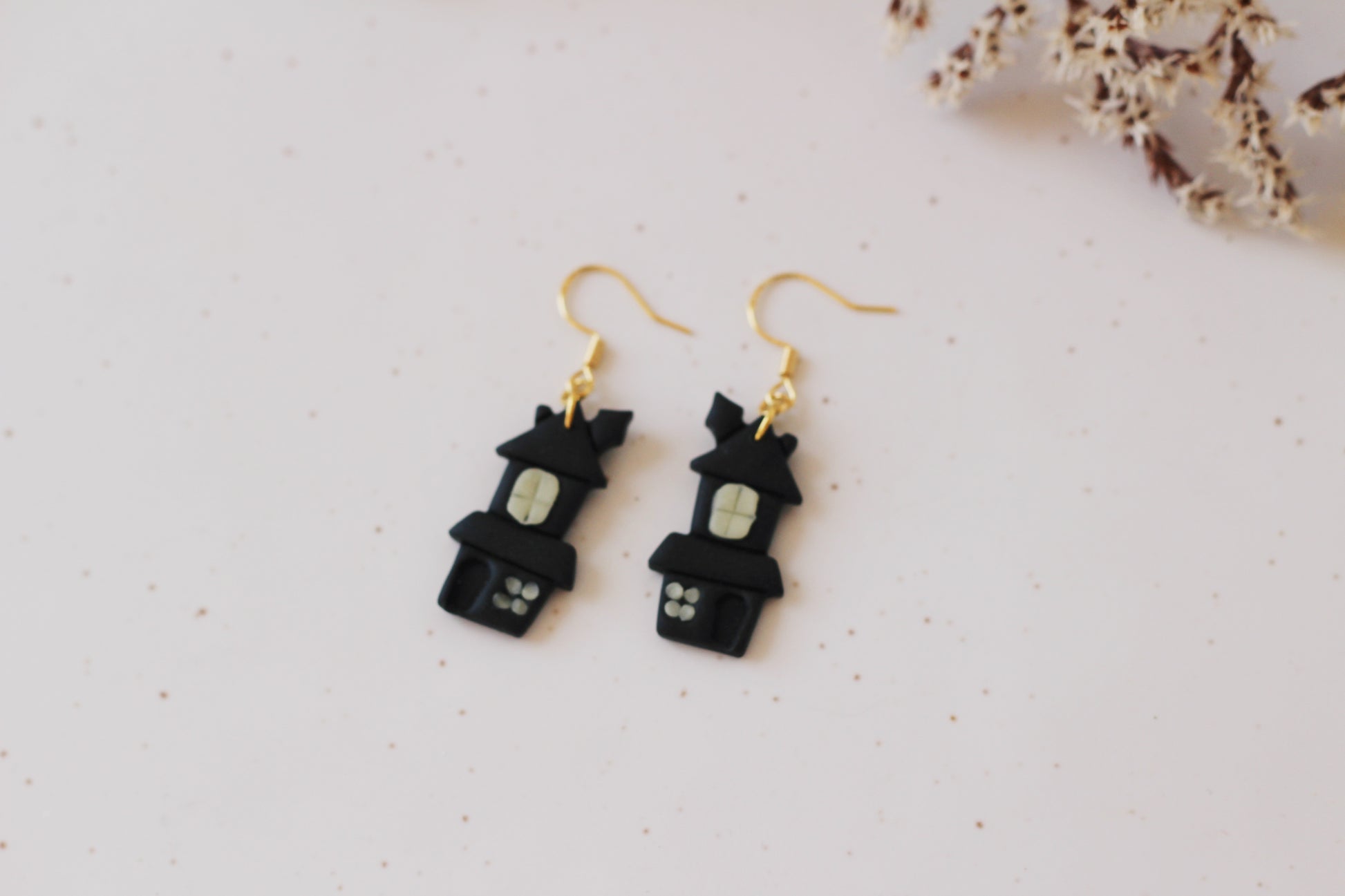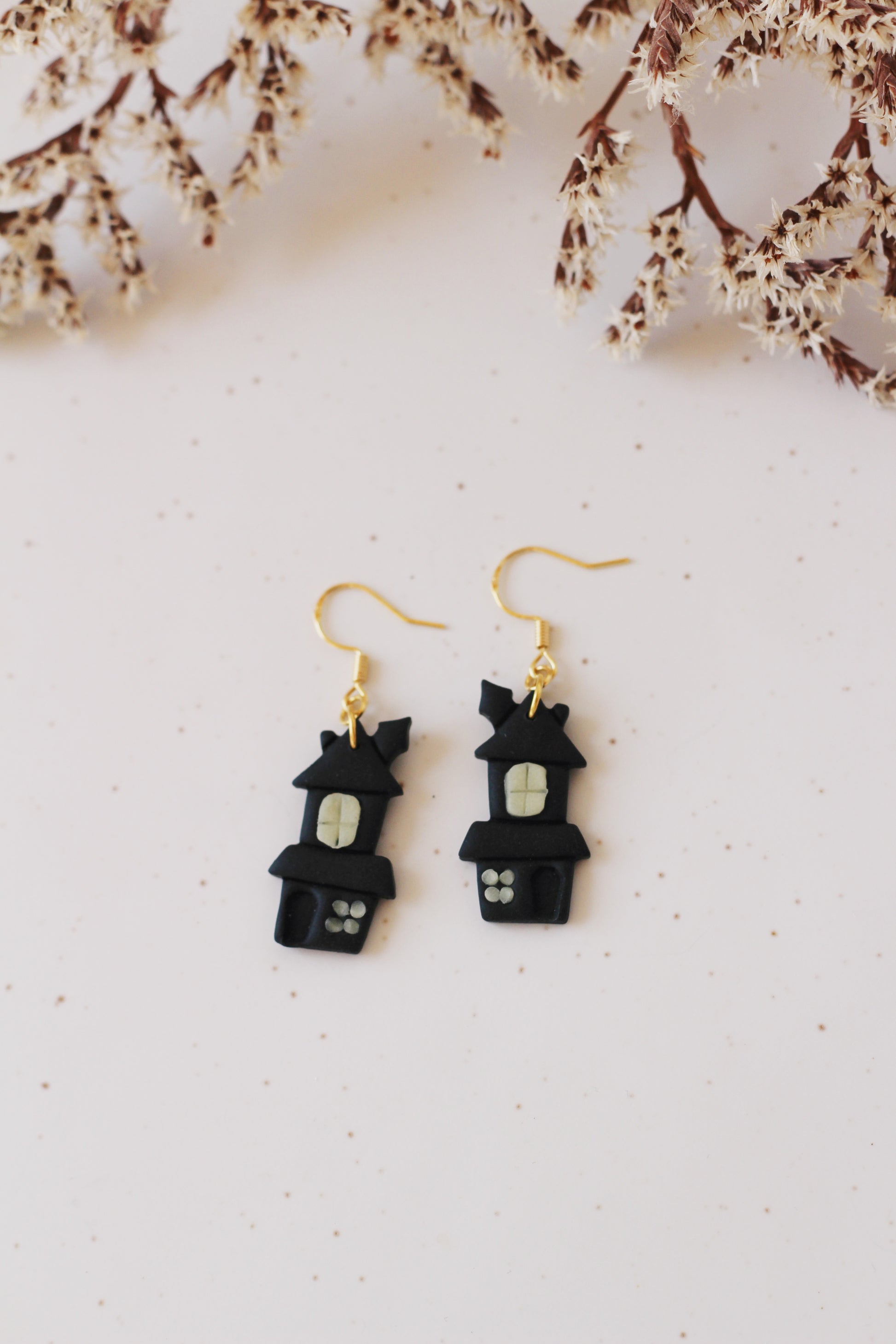 Polymer clay earrings made with 18k gold plated hardware. Lightweight, hypoallergenic, and nickel free. Windows in the haunted house glow in the dark!